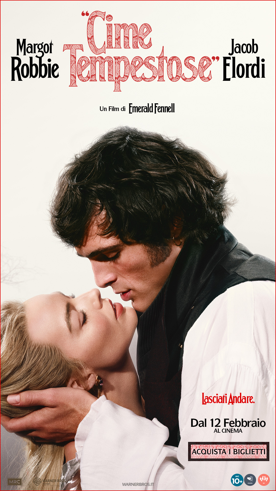 Un’audace e originale reinterpretazione di una delle più grandi storie d’amore di tutti i tempi, “CIME TEMPESTOSE” di Emerald Fennell vede protagonisti Margot Robbie nel ruolo di Cathy e Jacob Elordi in quello di Heathcliff. La loro passione proibita si trasforma da sentimento romantico a ossessione travolgente, in un’epica storia di desiderio, amore e follia.nnIl film è interpretato anche dalla candidata all’Oscar® Hong Chau, Shazad Latif, Alison Oliver, dal vincitore del BAFTA Martin Clunes e da Ewan Mitchell.nnEmerald Fennell firma regia e sceneggiatura, basata sul celebre romanzo Cime Tempestose di Emily Brontë, e contribuisce alla produzione insieme a Josey McNamara (candidata all’Oscar® e vincitrice del BAFTA) e Margot Robbie. I candidati all’Oscar® Tom Ackerley e Sara Desmond sono produttori esecutivi.nnFennell è affiancata dietro la macchina da presa dai suoi abituali partner creativi: il direttore della fotografia Linus Sandgren, vincitore di Oscar® e BAFTA; la scenografa Suzie Davies, candidata a Oscar® e BAFTA; la montatrice Victoria Boydell, candidata al BAFTA; la premiata direttrice del casting Kharmel Cochrane; e il compositore Anthony Willis, candidato al BAFTA. I costumi sono firmati dalla vincitrice di Oscar® e BAFTA Jacqueline Durran. Il film include le canzoni originali di Charli XCX.